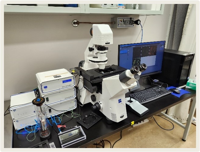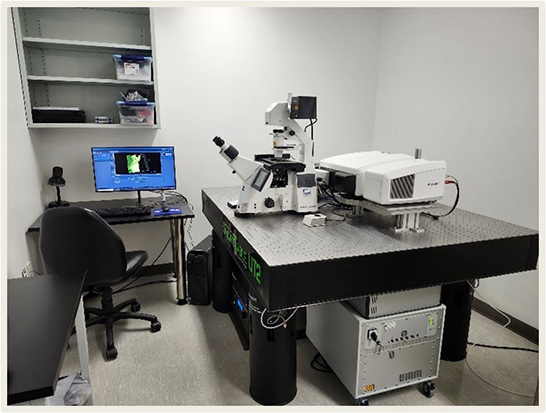 Confocal LSM980 – Mutliphoton – AiryScan2The Zeiss LSM980 multiphoton confocal microscope with AiryScan2 is equipped with standard laser sources at 405, 488, 568, and 639 nm, as well as a tunable pulsed laser ranging from 680 to 1080 nm for multiphoton microscopy. For detection, the system includes three adjustable PMT detectors covering the range from 400 to 850 nm. It also features an AiryScan2 detector, which enables a resolution of approximately 90 nm, using the same markers as standard confocal microscopy. Thanks to this detector, it is also possible to achieve an acquisition speed of 25 fps while maintaining confocal resolution at 512 × 512 pixels. |