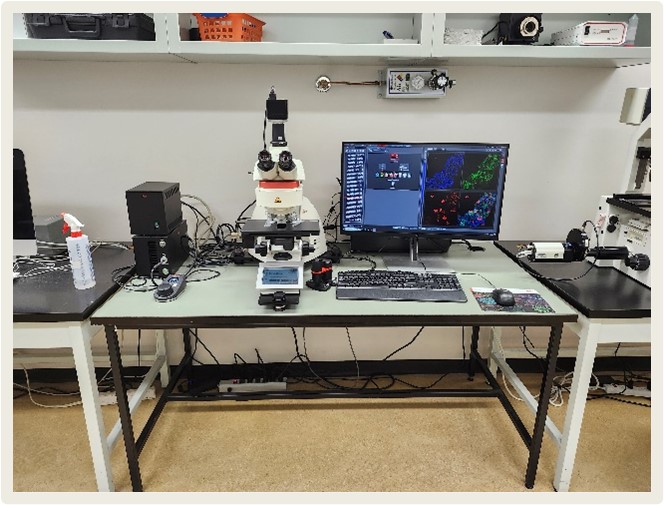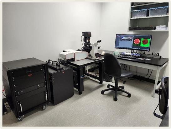 DM6BThe Leica DM6 B microscope is an upright microscope equipped with an XYZ motorized stage, enabling mosaic image acquisition. Image acquisition is performed using the LAS X software. This system includes five filter cubes (DAPI, GFP, Cy3, Texas Red, and Cy5) with an LED light source. It is also equipped with a Leica K5 sCMOS camera, offering a resolution of 2048 × 2048 pixels and a quantum efficiency greater than 80%. |