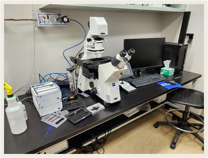 Spinning disk Confocal (rotary disc confocal)The confocal rotary disc microscope from ZEISS is an inverted microscope equipped with a Yokogawa CSU-1 module. This microscope is also equipped with a motorized XYZ stage and an incubator to maintain a stable physiological environment at controlled temperature, percentage of CO2 and O2. There are 4 laser lines for excitation (405, 488, 561 and 639 nm). The system also allows the excitation to be manipulated to perform transitions or photonic damage. |